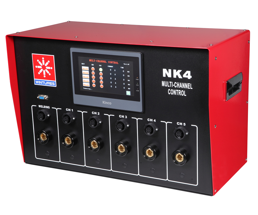 NK4採用ARM爲核心處理器,採用1500A高速可控矽和7ʺ觸摸控制屏,中英文切換,用優質的快速接頭作爲焊接電纜的接入方式,通常配置專用的小車,可以和KӦCO ××02,××10,××05i 系類以及 WINTUREW ××00i 系列焊接電源方便組合成一個一機多槍的高效螺柱焊接系統。在這個多槍系統中,可以同時兼容手動、半自動、全自動焊槍,和短周期、長周期、氣保各種焊接模式,很靈活。在每兩次焊接之間,需要間隔根據焊接電源暫載率限制的間隔時間。